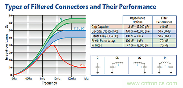 圖2還顯示了各種濾波器類型以及簡單芯片電容濾波器的相對濾波器性能。從這些數(shù)據(jù)可以看出,芯片電容的作用與前面提到的陷波濾波器相似,而C、CL、LC和Pi濾波器由平面陣列、盤狀電容器或陶瓷管構成,可提供更好的寬頻率和更高的濾波器性能總體水平。