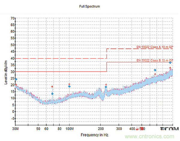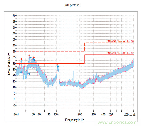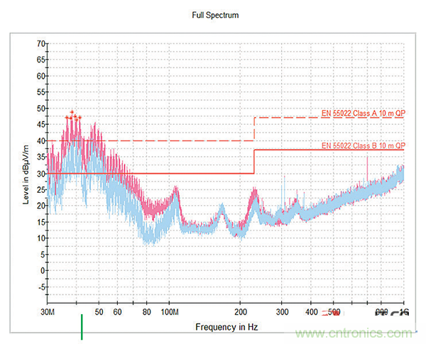 這種濾波器插入設計提供了最大的屏蔽效能,并使等效串聯(lián)電感最小化,為芯片電容器提供可用的最佳性能,同時還利用了系統(tǒng)中已存在的屏蔽。結合專用的22000pF濾波器,濾波器插入實現(xiàn)了圖10所示的結果,從而以具有成本效益的長期解決方案來滿足EMC法規(guī)。
