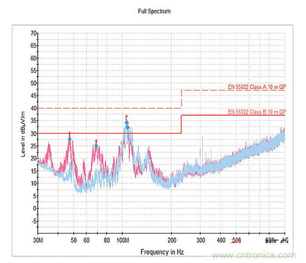 然后,使用22000pF芯片電容濾波器插件進行測試,試圖將最大濾波器性能調整到噪聲持續(xù)的較低頻率區(qū)域。如圖9所示,性能得到改善,在較低頻率的噪聲極限處或附近只有很小的尖峰。但是這個濾波器導致能量“膨脹”到105MHz附近的更高頻率,超過了允許的極限。