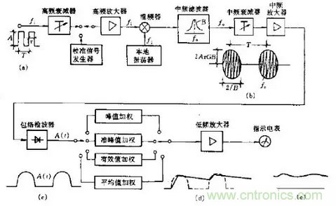 圖中(d)點的波形是準(zhǔn)峰值加權(quán)波形,(e)點是電表讀數(shù)。由于電表具有一定的慣性(即電表機(jī)械時間常數(shù))所以電表讀數(shù)將受一定影響,因此標(biāo)準(zhǔn)規(guī)定電表應(yīng)處于臨界阻尼狀態(tài),并具有確定的機(jī)械時間常數(shù)。雖然現(xiàn)在大多使用數(shù)字化電表,該指標(biāo)仍然保留,只要在A/D變換器后加一個二階低通濾波器即可。