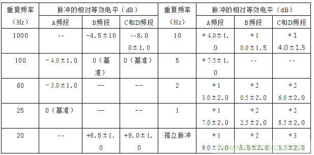 為了鑒別騷擾測量儀是否達(dá)到了表2規(guī)定的四大類指標(biāo),標(biāo)準(zhǔn)又進(jìn)一步規(guī)定了騷擾測量儀的絕對脈沖特性和相對脈沖特性。所謂絕對脈沖特性指輸人規(guī)定的周期脈沖信號時騷擾測量儀的讀數(shù)應(yīng)達(dá)到規(guī)定的值。絕對脈沖特性見表3。