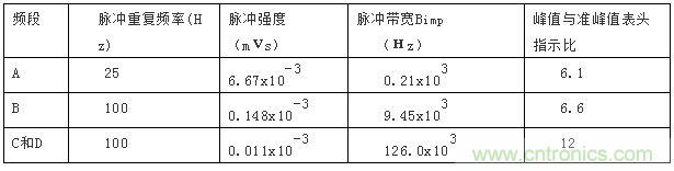 表3的含義是:在A、B、C、D各頻段內(nèi),分別輸入各自的標(biāo)準(zhǔn)周期脈沖,要求脈沖的幅度×寬度等于a(μVs),重復(fù)頻率為c(Hz),該周期脈沖的頻譜至少應(yīng)該在b(MHz)以下是均勻的,脈沖信號發(fā)生器的源阻抗應(yīng)和騷擾測量儀輸入阻抗相等。對于該輸人信號,騷擾測量儀在該頻段的任何頻率上的讀數(shù)都應(yīng)該等于60dB(μV)。
