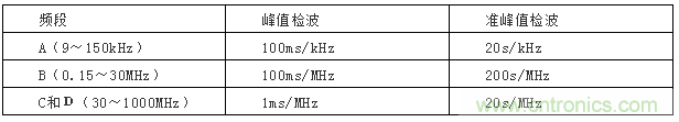 在準(zhǔn)峰值測量時,如想要在某個頻率點得到較穩(wěn)定的測量值,則測量時間應(yīng)大于檢波器充放電時間和電表機(jī)械時間常數(shù)之和,并且測量不止一個周期,所以一般準(zhǔn)峰值測量時間要求比較長。如果測量儀具有掃頻測量功能,則設(shè)置的掃描時間應(yīng)符合表9的規(guī)定。在實際測量中,往往先用峰值進(jìn)行全頻段測量,然后再對超過限值的頻率點進(jìn)行峰值測量,這樣可以大大節(jié)省測量時間。