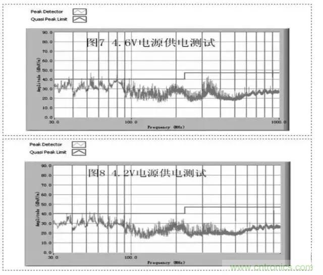 因為傳導(dǎo)、輻射的數(shù)值與dv/dt 或者 di/dt成正比,所以電壓越高,傳導(dǎo)、輻射的數(shù)值越大。樣品的供電電壓是4.6V,當電壓調(diào)整供為4.2V后,從實驗數(shù)據(jù)可以看出,發(fā)現(xiàn)尖峰毛刺也能得到一定改善(圖7、圖8)。
