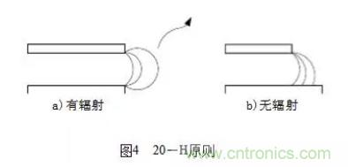 (1)20-H原則,決定印制線條間的距離,表述如下:所有的具有一定電壓的PCB都會向空間輻射電磁能量(如圖4a),為減小這個效應(yīng),PCB的物理尺寸都應(yīng)該比最靠近的接地板的物理尺寸小20H(其中H是兩層PCB的間距),即3mm左右,這樣可使輻射強(qiáng)度下降70%(如圖4b)。20-H原則示意圖如圖4所示: