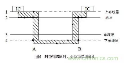 在布線時盡量少穿過孔,因為過孔阻抗和線阻抗不一樣,存在阻抗突變,從而產(chǎn)生駐波使信號變壞,容易形成輻射,尤其是在時鐘需要穿層時,要做技術(shù)處理,時鐘線跨層時的處理如圖6所示。