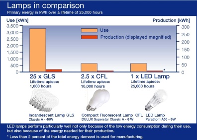 此次研究是與西門子研究院生態(tài)創(chuàng)新中心 (Siemens Corporate Technology, Centre for Eco Innovations) 的專家合作進(jìn)行的。研究結(jié)果表明,LED 燈與緊湊型熒光燈相似,也是將超過 98% 的能耗用于發(fā)光,只有不到 2% 的能耗用于生產(chǎn),這就打消了人們認(rèn)為生產(chǎn)LED 可能特別耗費(fèi)能源的擔(dān)憂。白熾燈的一次能源消耗為 3,300 kWh 左右,而 LED 燈的一次能源消耗不到 700 kWh,因此,LED 燈顯然比傳統(tǒng)白熾燈更高效。除此之外,該評估結(jié)果還表明,LED 燈在整個生命周期中對環(huán)境的影響始終優(yōu)于白熾燈。