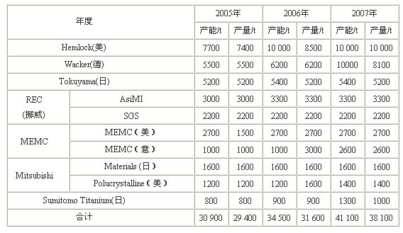 表1 2005-2007年國外硅材料企業(yè)的產能和產量情況