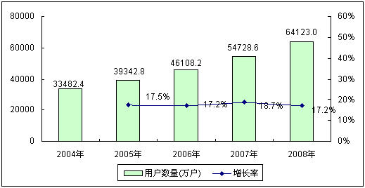圖1 2004-2008年中國(guó)移動(dòng)電話用戶規(guī)模與增長(zhǎng)