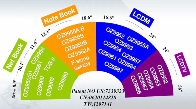 基于這樣的技術(shù)積累,目前凹凸科技已成為擁有最廣泛LCD背光驅(qū)動(dòng)IC產(chǎn)品線的廠商,如圖1所示,從上網(wǎng)本到筆記本電腦再到LCD顯示器模塊、LCD TV,尺寸從8.9吋橫跨到56吋,凹凸科技能提供滿足各類應(yīng)用需的相應(yīng)LED驅(qū)動(dòng)器解決方案(具備不同的效率等級(jí)、PWM接口、不同通道數(shù)),包括3x9、4x7、4x8、6x10、8x8、8x9等不同配置。多種技術(shù)特性如集成高速PWM功能、采用快速切換的開關(guān)模式、突波模式與相移技術(shù),及其專有的區(qū)域照明等技術(shù),則可幫助開發(fā)人員解決多串?dāng)?shù)LED均流、LED線性調(diào)光所產(chǎn)生的噪聲、功率耗散,以及廠商對(duì)于保護(hù)規(guī)格要求不一等挑戰(zhàn)。
