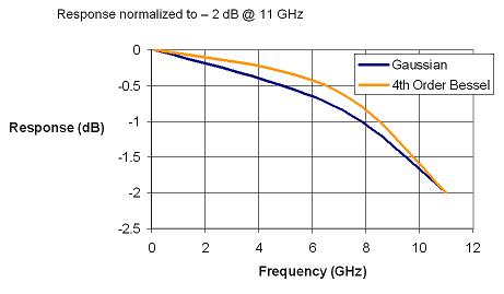 Gaussian響應(yīng)在-3dB之后仍衰減很慢。其優(yōu)點(diǎn)是允許被測(cè)信號(hào)的更高頻率成分的諧波能量通過放大器(這是假定其有采樣率遠(yuǎn)超過Nyquist),對(duì)于特別快的快沿測(cè)量有幫助。其缺點(diǎn)是在低頻段使被測(cè)信號(hào)嚴(yán)重衰減,特別是對(duì)3次諧波的衰減嚴(yán)重,導(dǎo)致眼圖測(cè)量中產(chǎn)生"花生眼"。