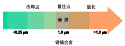 更高溫度和與被焊接部件更長時(shí)間的接觸也可能增加金屬化合物的結(jié)合層。從而不建議延長接觸時(shí)間和重復(fù)返工。上圖表顯示了隨著結(jié)合層的厚度增加,脆化現(xiàn)象發(fā)生的機(jī)率就更大。[page]
