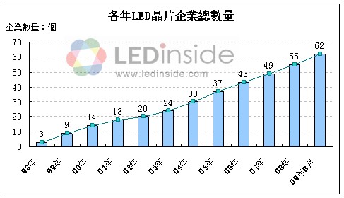 - 至2009年8月現(xiàn)存LED芯片生產(chǎn)企業(yè)達(dá)62個(gè)