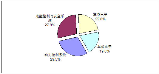 圖2 2008年中國(guó)汽車電子市場(chǎng)應(yīng)用結(jié)構(gòu)