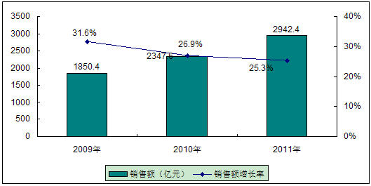 圖3 2009-2011年中國(guó)汽車電子市場(chǎng)規(guī)模與增長(zhǎng)預(yù)測(cè)