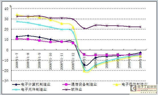 2008年三季度,受全球金融危機(jī)的影響,中國電子信息產(chǎn)業(yè)出現(xiàn)下滑趨勢。7-8月,主營收入增長率下滑0.2個百分點,8-9月,增長率下滑1.3個百分點。進(jìn)入第四季度,下滑幅度開始增大,9-10月,增長率下滑了1.9個百分點,至2009年2月,主營收入增長率跌至最低點。從2009年2月電子信息產(chǎn)業(yè)振興規(guī)劃獲得通過,4月振興規(guī)劃正式發(fā)布到7月期間,伴隨著“家電下鄉(xiāng)”,“汽車下鄉(xiāng)”、調(diào)整出口退稅稅率等政策相繼實施,振興規(guī)劃對電子信息產(chǎn)業(yè)的提振效應(yīng)開始顯現(xiàn)。賽迪顧問研究數(shù)據(jù)顯示,從2009年4月起,電子信息產(chǎn)業(yè)經(jīng)濟(jì)運行開始出現(xiàn)企穩(wěn)跡象,主營收入降幅趨緩,并逐漸開始走出低谷。