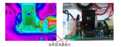 大的器件,所以必須加裝散熱片使其長期穩(wěn)定工作溫度不超過120℃;在拍攝熱圖時,散熱片是鋁合金材料經(jīng)過發(fā)黑處理,其表面雖然為黑色但其發(fā)射率還是較低,建議用油漆筆涂黑后進(jìn)行檢測,或在溫度穩(wěn)定一段時間后直接測量功率管的溫度。