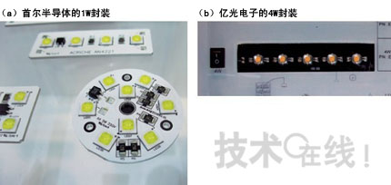 臺灣億光電子(Everlight Electronics)展出了其首款交流驅(qū)動封裝產(chǎn)品——功耗為1W和4W的樣品。這款封裝產(chǎn)品著眼于照明用途,首先將在臺灣和中國大陸上市。與上屆一樣,三墾電氣仍然展出了小型封裝產(chǎn)品。由于發(fā)光效率較低,設(shè)想的是電源分接頭等指示用途。