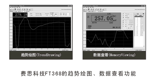 費思FT368拍馬挑戰(zhàn),更是挾系列高級功能重裝上陣,其標配的高速數(shù)據(jù)接口和FaithtechView測試包可實現(xiàn)5項高級功能:趨勢繪圖,數(shù)據(jù)記錄分析,邏輯分析,單通道示波,諧波分析。費思FT368的高級功能充分享受了IT技術(shù)發(fā)展的成果(PC機的能力太強大), 其趨勢繪圖和數(shù)據(jù)記錄分析的功能多樣性、數(shù)據(jù)豐富性、圖形可視性、操作實用性等方面和福祿克287相比已經(jīng)不在一個級別,當然費思FT368使用這些功能必須外接一臺PC機。