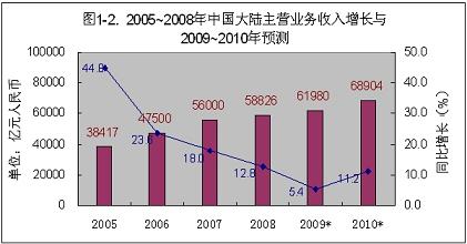 據(jù)工業(yè)和信息化部運(yùn)行監(jiān)測協(xié)調(diào)局統(tǒng)計,今年1~9月份,中國大陸電子制造業(yè)主營業(yè)務(wù)收入35,285億元,同比增長-1.8%;從1月份的-15%收窄到9月份的-1.8%,平均每月收窄1.65個百分點。據(jù)此平均值推算,并考慮到第四季度一般要好于前三個季度的情況,規(guī)模以上電子信息制造業(yè)主營業(yè)務(wù)收入,將在10月份接近去年的同期水平,到今年年底,制造業(yè)主營業(yè)務(wù)收入應(yīng)能回升到3.2%,達(dá)到52,892億元(見圖1)。據(jù)工業(yè)和信息化部運(yùn)行監(jiān)測協(xié)調(diào)局統(tǒng)計,今年1~9月份軟件業(yè)收入6775億元,同比增長20.3%,。如能繼續(xù)保持20%左右的增長,今年的軟件收入可達(dá)9,088億元。則2009年電子信息行業(yè)的總營業(yè)額將達(dá)到61,980億元(約折合9,115億美元),總營業(yè)額將比2008年增長5.4%。預(yù)計2010年,在國際經(jīng)濟(jì)回暖和繼續(xù)擴(kuò)大內(nèi)需的推動下,中國大陸電子信息產(chǎn)業(yè)主營業(yè)務(wù)總收入將實現(xiàn)11.2%左右的增長,達(dá)到68,904億元(約折合10,133億美元)(見圖2)。