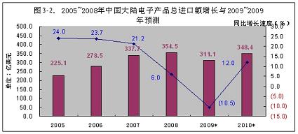 根據(jù)國家海關(guān)總署提供的數(shù)據(jù)分析,今年1~9月份電子產(chǎn)品進(jìn)口總額為3,017.6億美元,同比下降18.2%,比元月份回升了28.9個百分點。按每月進(jìn)口額回升幅度的平均值(2.5個百分點)推算,今年總進(jìn)口額下降速度應(yīng)回升到-10.5%,達(dá)到3,111億美元(見圖3-1)。中國大陸進(jìn)口的主要電子產(chǎn)品是電子元器件和技術(shù)設(shè)備,預(yù)計2010年,在電子整機(jī)出口回升和國內(nèi)需求增長的驅(qū)動下,總進(jìn)口額將達(dá)到或超過2008年的3,476美元水平(見圖3-2)。
