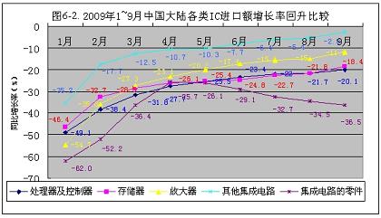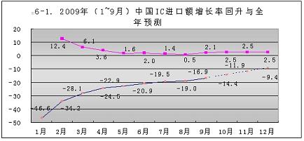 今年1~9月份,中國大陸進(jìn)口集成電路的降幅不斷回升,從元月份的-46.6%,回升到9月份的-16.9%。共回升了29.7個百分點。按此回升速度,到今年年底可回升到-9.4%(見圖6-1)。