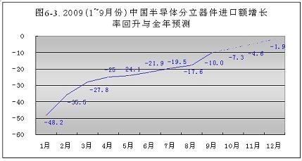今年1~9月份,半導(dǎo)體分立器件進(jìn)口額增長率回升明顯。從元月份的-48.2%,回升到9月份的-10.0%,共回升了38.2個百分點。按此回升速度,到今年年底可回升到-1.9%(見圖6-3)。