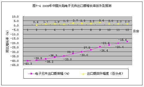 2009年1~9月份,中國大陸電子組件出口額增長率從元月份的-40.3%,回升到9月份的-24.4%?;厣?5.9個百分點。按此回升速度計算,到今年年底,可回升到-18.4%(見圖7-4)。