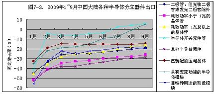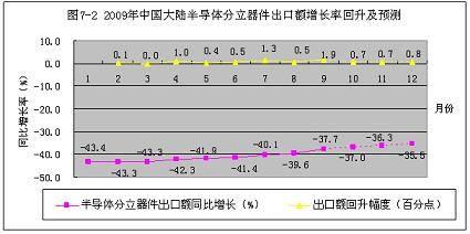2009年1~9月份,中國大陸半導(dǎo)體分立器件出口額增長率從元月份的-43.4%,回升到9月份的-37.7%。只回升了5.7個百分點。按此回升速度計算,到今年年底,只能回升到-35.5%,預(yù)計2010年會有所好轉(zhuǎn)(見圖7-2)。
