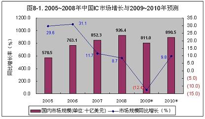 2009年,受國際金融危機(jī)影響,電子產(chǎn)品出口受阻,整機(jī)產(chǎn)量有所下降,國內(nèi)集成電路的需求規(guī)模,同2008年相比將下降12.4%,約為811億美元(見圖8-1)。其中,90%左右仍靠進(jìn)口。