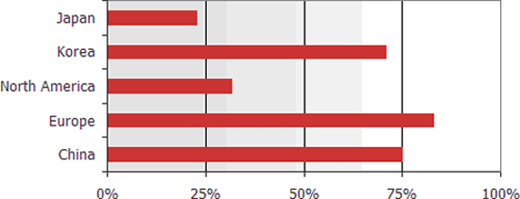 DisplaySearch研究指出,不同地區(qū)市場的電視性能有顯著的差異。例如在待機(jī)能耗的部份,日本電視要求在0.3瓦特以下,歐洲電視則在0.5瓦特以下,然而在北美,即便是經(jīng)過能源之星(Energy Star)認(rèn)證的電視,待機(jī)時(shí)消耗功率仍維持在0.5到0.6瓦特之間。Paul Gray補(bǔ)充說:“實(shí)際上我們發(fā)現(xiàn)在北美仍有許多電視待機(jī)時(shí)消耗功率超過1瓦特。如果其它地區(qū)能如加州一樣倡導(dǎo)電力節(jié)省,將可以同時(shí)節(jié)省消費(fèi)者的荷包。”
