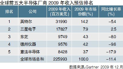 根據(jù)市場(chǎng)調(diào)研公司Gartner的估計(jì),2009年全球半導(dǎo)體行業(yè)總收入為2.26億美元,同比下滑11.4%,這將是該行業(yè)25年來經(jīng)歷的第六次收入下滑。 Gartner分析稱,個(gè)人電腦市場(chǎng)是最先反彈的市場(chǎng),隨后是手機(jī)、汽車等市場(chǎng)開始反彈。此外,盡管收入下滑,英特爾仍連續(xù)18年蟬聯(lián)年收入額第一,2009年,該公司的市場(chǎng)份額增加到14.2%。