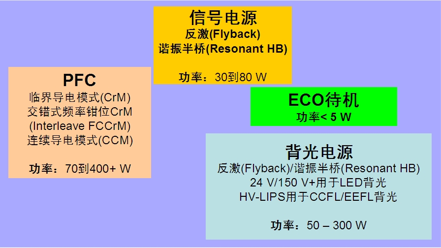 液晶電視電源包含功率因數(shù)校正(PFC)、信號電源、背光電源及ECO待機(jī)等多個組成部分,不同部分往往包含不同的架構(gòu)可供選擇,參見圖1。以PFC段為例,可以選擇如臨界導(dǎo)電模式(CrM)、連續(xù)導(dǎo)電模式(CCM)或交錯式頻率鉗位臨界導(dǎo)電模式(FCCrM)等不同的PFC控制器。選擇何種電源架構(gòu),需結(jié)合應(yīng)用的屏幕尺寸、功率等級及背光源等因素。另外,作為重要賣點(diǎn)的纖薄設(shè)計也影響著電源方案的選擇。