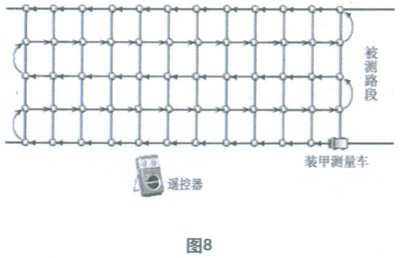 本方案是將具有記憶和存貯功能的TES—1333型照度記安置在高檔電動遙控的履帶式玩具裝甲車(以下簡稱為測試小車)上,該測試小車的驅(qū)動系統(tǒng)受站在路邊的測量者手中的遙控器和測試小車內(nèi)安置的可編程控制器為主體的自動控制系統(tǒng)控制,當(dāng)車內(nèi)的自動控制系統(tǒng)啟動時,裝甲車將按照事先設(shè)定的動作程序沿如圖8所示的箭頭方向完成行走程序,并采用四點法在每個矩形網(wǎng)格的四角處自動完成照度測量和記錄,存貯任務(wù),待全部程序結(jié)束后,測試小車在遙控器的操縱下自動返回測量者所在位置。遙控器的另一作用是在車內(nèi)控制系統(tǒng)失靈的情況下,由測量者手動遙控完成全部的測量過程,并在道路出現(xiàn)行駛車輛時緊急召回測試小車。