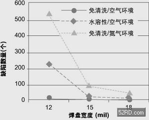 圖1顯示出三種不同組裝工藝的良品率情況。由圖可見,使用免清洗焊膏在空氣環(huán)境下進行回流焊產(chǎn)生的不良最少,總數(shù)為66個;使用水溶性焊膏在空氣環(huán)境下進行回流焊次之,不良有1,499個;使用免清洗型焊膏在充氮環(huán)境下進行回流焊產(chǎn)生的不良數(shù)最多,為5,665個。圖3還表明在充氮環(huán)境下以及焊膏助焊成分活性增大(水溶性焊膏)時,產(chǎn)生的不良數(shù)目會增多。