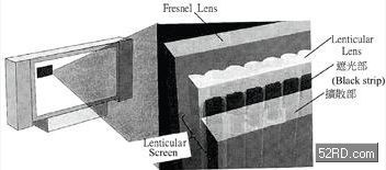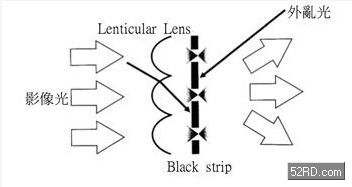 LenticularLens除了可以收斂遮光部開口位置的光線之外,它還會(huì)將入射的影像光線擴(kuò)散到水平方向,此外LenticularLens為了支援高解析度(HD)影像,因此要求非常微細(xì)的鏡片間距(LensPitch),因?yàn)榇执蟮溺R片間距可能會(huì)導(dǎo)致FresnelLens、LenticularLens與投影影像畫素出現(xiàn)波紋。