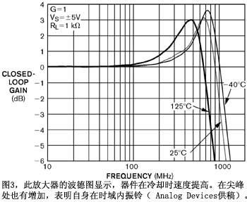 很多放大器,如AnalogDevices的AD8045,在冷卻時會加速(圖3),而有些放大器(如AD8099)則在變冷時會降速。已退休的LinearTechnology信號處理產(chǎn)品前副總裁兼總經(jīng)理BillGross稱:“雙極晶體管在低溫下遇到的多數(shù)麻煩是低電壓工作。”他認為,較高的基射電壓和較小的電流增益都更難于滿足規(guī)格要求。他說:“較低的輸入阻抗和b(電流增益)的不匹配都會造成低溫下的大問題。尤其是當它們?yōu)槭覝剡\行作了調(diào)整時。較高的gm(跨導(dǎo))很容易通過改變工作電流而得到補償,但這樣的話轉(zhuǎn)換速率就會變化。”