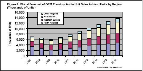 據(jù)iSuppli公司,在2009年下滑之后,全球車用高端音響系統(tǒng)的出貨量在2010年將以兩位數(shù)速度增長,從而為該市場在2016年翻倍鋪平道路。