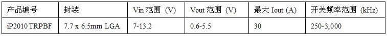 iP2010的輸入電壓范圍為7V至13.2V,輸出電壓范圍則為0.6V至5.5V,輸出電流高達(dá)30A。這個(gè)器件最高運(yùn)行頻率為3MHz。在5MHz運(yùn)行時(shí),與iP2010引腳兼容的iP2011備有相同的輸入和輸出電壓范圍,但后者經(jīng)過優(yōu)化,從而使最高輸出電流高達(dá)20A。通過以通用占位面積提供多種電流額定值器件,IR提供的靈活性能夠滿足不同客戶對(duì)電流水平、性能和成本的要求。