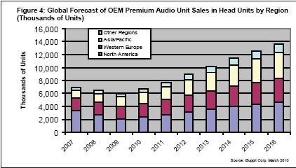 北美是車用高端音響系統(tǒng)的最大市場(chǎng)。該地區(qū)OEM高端音響單位出貨量預(yù)計(jì)到2016年將增長(zhǎng)到460萬(wàn)套,而2007年是330萬(wàn)。