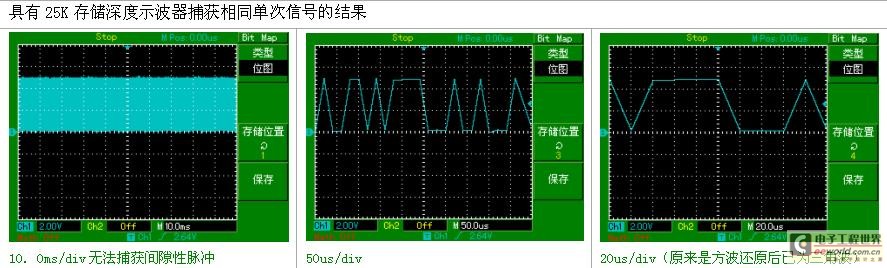 提高示波器的存儲深度可以間接提高示波器的采樣率。以一臺采樣率為1Gsa/s、存儲深度為20K的示波器為例來說,只要水平掃描速度在20ns/div以上時基,采樣速度就會急速下降。因為當(dāng)需要測量較長時間的信號波形時,必然要求大的時基檔位,這就造成采樣率的下降,采樣率的下降可能會遺漏信號的細節(jié)勢必造成信號波形質(zhì)量的下降。這時候就需要大的存儲深度來維持更高的采樣率來采樣測量。長存儲在保證獲取不失真的波形的同時又可以觀察更長時間的信號。