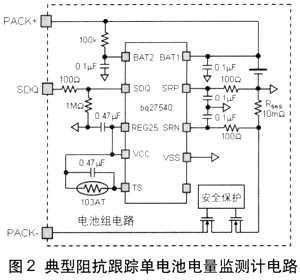 阻抗跟蹤鋰離子單節(jié)電池組電路如圖2所示。通過BAT2引腳輸入端測量電池電壓,通過庫侖計數(shù)器差動信號輸入端(SRP及SRN)監(jiān)測電流。系統(tǒng)利用電量監(jiān)測計從單線SDQ通信端口獲得SOC及運行時間接近結(jié)束(Run-Time-to-Empty)等信息。