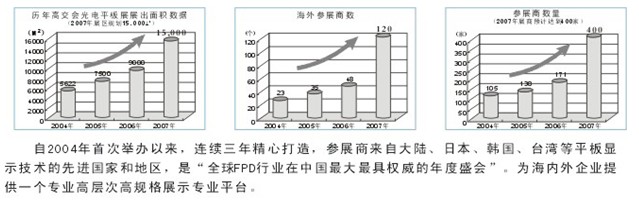 ●“光電平板顯示展”將吸引知名FPD企業(yè)的高管(日立、夏普、三星、LG、友達、華映等)、通路商的高管、政府要員、技術人員等近五萬人到場,同時組委會將通過國內(nèi)外相關行業(yè)協(xié)會、商會組織專業(yè)士參觀。
