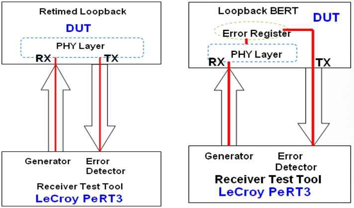 對(duì)于USB3.0的接收機(jī)測(cè)試還可以使用另一種方法:即Loopback BERT Method。如下圖7的右圖所示:DUT的接收端工作在Loopback BERT模式,直接分析BERT發(fā)送出的已知的測(cè)試碼流,對(duì)接收到的誤碼計(jì)數(shù),誤碼數(shù)量存入誤碼寄存器(如下圖7的Error Register),LeCroy PeRT3直接讀取誤碼寄存器,得到誤碼率和抖動(dòng)容限測(cè)試結(jié)果。