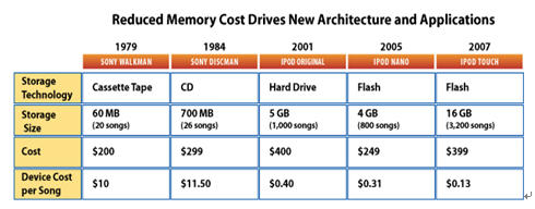 在如此高的累積數(shù)量增長下推動學習曲線的成本下降,在過去10年中每年晶體管的成本下降35%及總體上能使新的應用市場達到規(guī)模化。如2001年的MP3播放機的價格與今天的攝像機相同, 而今天攝像機中用的存儲器容量增長了10倍, 而且與2001年時的尺寸及功耗幾乎相同。