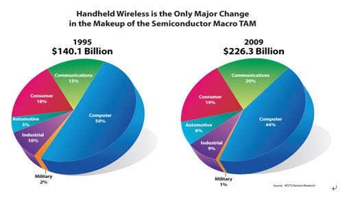 那么未來將會是怎么樣呢?只要晶體管的數(shù)量按目前的高增長倍率繼續(xù)走下去,各種新的應用會層出不窮,推動半導體市場總量進一步提高。因此全球半導體市場在近15年來看似十分穩(wěn)定,雖然如臺式計算機市場已經(jīng)飽和,但是筆記本電腦和上網(wǎng)本開始流行,加上消費類電子產(chǎn)品如游戲機,平板電視,MP3, 數(shù)碼相機等, 由于半導體含量的增加推動了半導體TAM的增加。