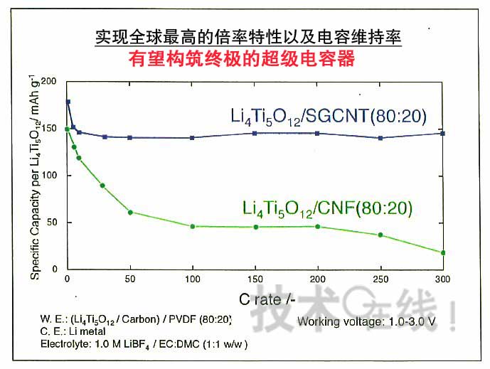 東京農(nóng)工大學研究生院于2009年3月宣布,開發(fā)出了采用碳納米纖維(CNF)與LTO復合而成的負極的鋰離子電容器,與以往的采用活性炭的雙電層電容器相比,實現(xiàn)了約3倍的能量密度。而且還表示,將完善由日本Chemi-Con定于2011年春季樣品供貨采用該技術的鋰離子電容器的體制。