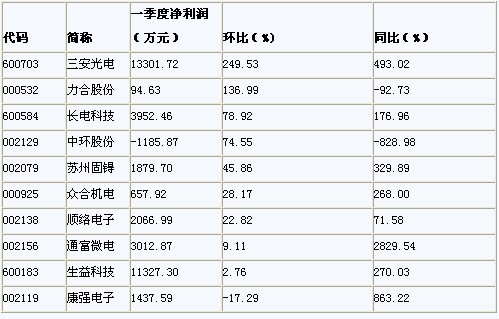 另外從電子類上市公司的已公布一季度報告的上市公司來看,三安光電、力合股份、長電科技分列凈利潤環(huán)比上漲前三位。其中三安光電和長電科技分別受益于國家新興產(chǎn)業(yè)政策中的LED和手機支付。三安光電是國內(nèi)規(guī)模最大的全色系超高亮度LED芯片生產(chǎn)企業(yè),而長電科技是國內(nèi)半導體封裝的龍頭企業(yè)。在國家不斷推出支持新興產(chǎn)業(yè)發(fā)展的政策大背景下,電子行業(yè)的景氣度還將繼續(xù)維持在高位。