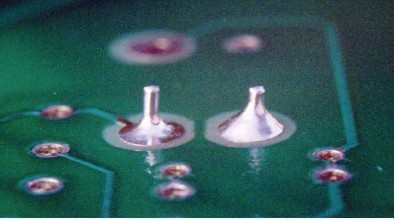 在波峰焊的實(shí)際使用中,助焊劑的全板噴涂和錫渣的產(chǎn)生都帶來了較高的使用成本。尤其當(dāng)使用無鉛焊料時,由于無鉛焊料的價格是有鉛焊料的3倍以上,錫渣產(chǎn)生所帶來的使用成本增加是驚人的。此外,無鉛焊料不斷溶解線路板焊盤上的銅,時間一長便會在錫缸中產(chǎn)生晶須(銅),這需要我們不斷添加昂貴的錫銀來加以解決。(見圖4)