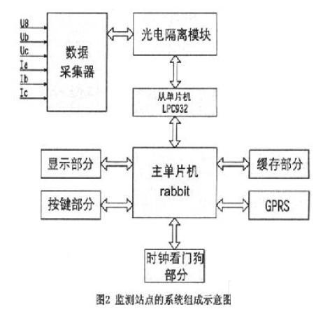 監(jiān)測站點由前端數(shù)據(jù)采集器和現(xiàn)場下位機構(gòu)成,其中前端數(shù)據(jù)采集器采用CS5460模塊和LPC932單片機構(gòu)成,它負責(zé)采集監(jiān)控現(xiàn)場的各項數(shù)據(jù)并存儲。線路的內(nèi)部經(jīng)過嚴格的電磁隔離,測量電路經(jīng)過采樣、A/D轉(zhuǎn)換處理后形成的數(shù)字信號再經(jīng)過光電耦合由信號適配器向從單片機LPC932傳送,主單片機與從單片機之間可采用I/O口模擬時序的方式進行串口通信。
